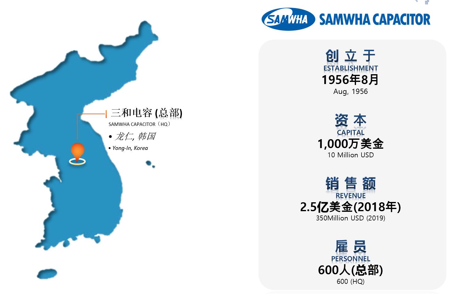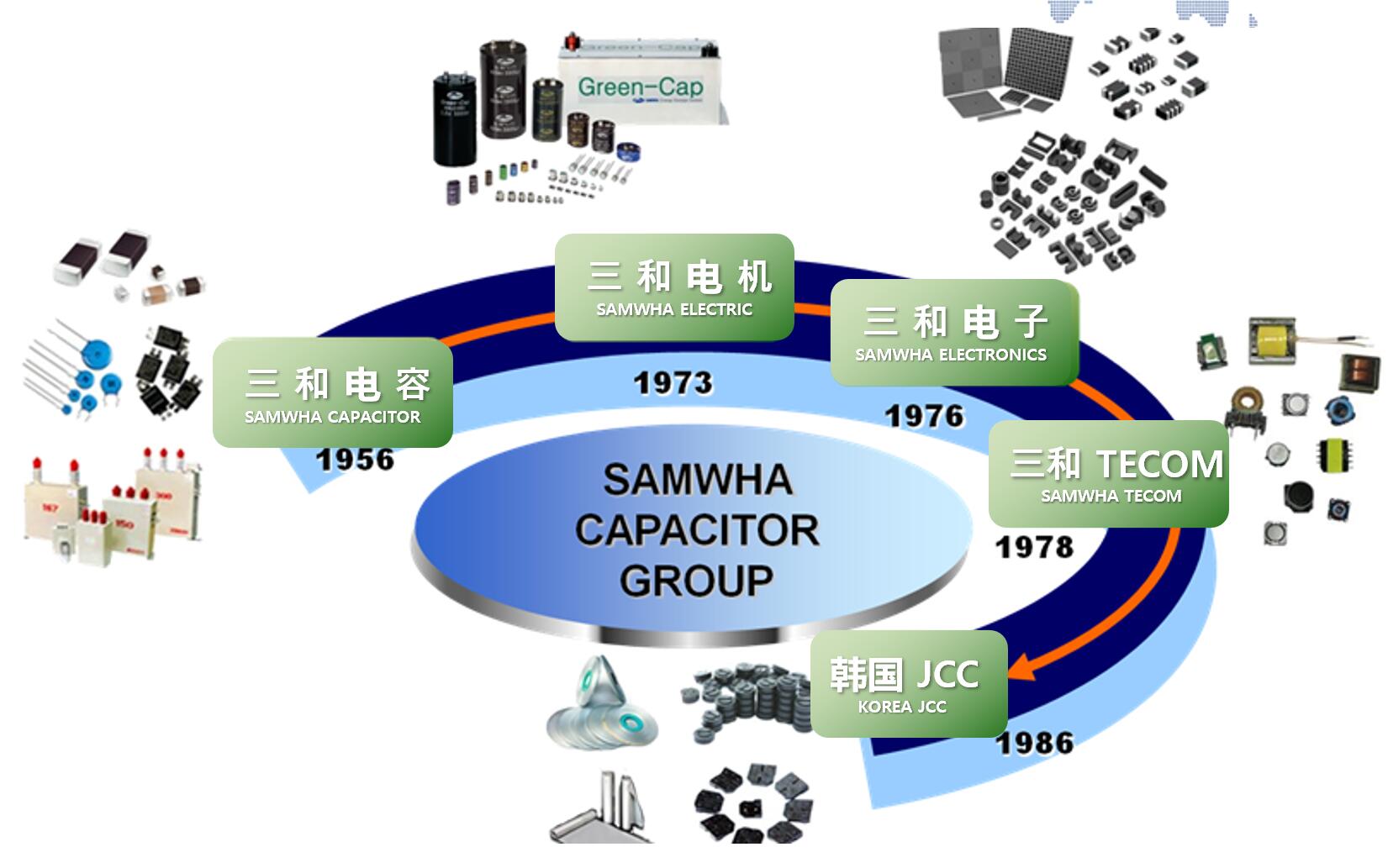 韩国三和(SAMWHA)电容工业株式会社是韩国三和电容集团的高科技企业,成立于1956年,投资总额为人民币1亿2千万,注册资金为人民币8千万,工业占地面积4万577平方米,建筑面积2万6393平方米,已通过UL,CSA,VDE,TUV,BSI,DEMKO,NEMKO,FIMKO,SEMKO,KS,ISO9001,ISO14001认证,同时,由于业务范围的不断扩大,三和现亿分别在中国、美洲、欧洲、东南亚等9个国家设立了12家本土生产企业与销售公司,正逐步成长为国际一流企业。